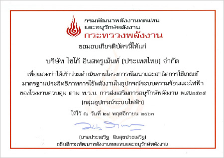 The Gateway factory of SIT participated in the Energy Efficiency Project sponsored by the Department of Alternative Energy Development and Efficiency (the efficiency bureau), Thailand, which asks companies to participate in a survey to determine the energy efficiency standards for factories. The Gateway factory cooperated in field surveys such as the chiller power usage survey and the efficiency bureau presented them with a certificate of appreciation for their participation in the project.